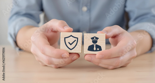 Work safety concept. Regulations and standard in industry. Working standard process and zero accidents. Person holding wooden block with work safety.