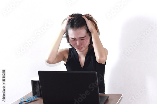 computer, laptop, business, woman, businesswoman, office, notebook, young, work, white, isolated, people, technology, cyberspace, person, problem, secretary, desk, corporate, professional, frustration, sitting, working, stress, face
