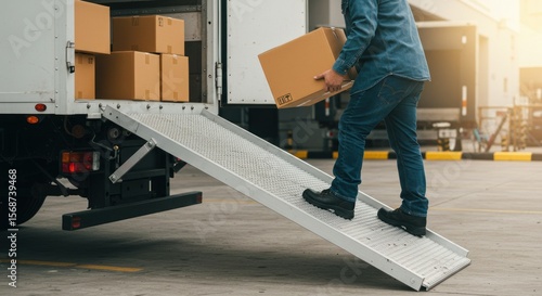 men at work, ramp, loading, truck, box, cardboard, delivery, logistic, freight, warehouse, cargo, transportation, unloading, shipping, industrial, business, man, good, moving, package, step, metal, concrete, outside, sunny, daylight, commerce, transport, effort, efficiency, skilled, focused, task, assistance, cartage, container, commercial, industry, labor