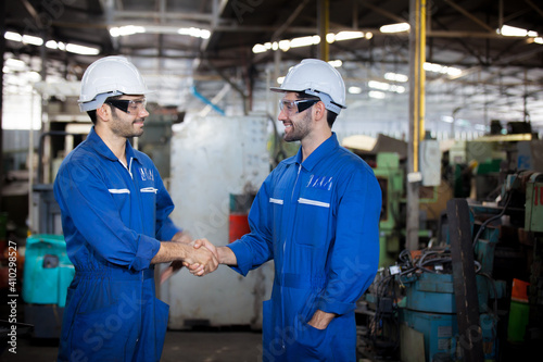 worker in protective uniform shaking hands. orkers in protective helmets shaking hands while working in factory