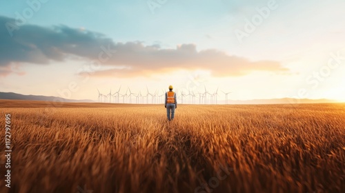 Worker in Safety Gear Walking Through Wheat Field at Sunset with Windmills