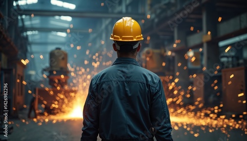 Worker in yellow helmet observes high-temperature metalworking in industrial workshop. Sparks, fire around, blue-collar worker. Steel industry, heavy machinery, engineering, safety-gear manufacturing.