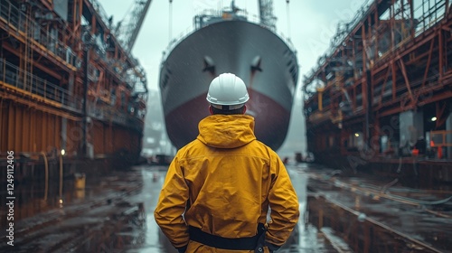 Worker in Yellow Rain Jacket Stands Before Large Ship in Shipyard Surrounded by Industrial Cranes and Machinery on Foggy Day