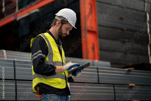Worker man wearing reflective jacket holding digital tablet standing in factory warehouse