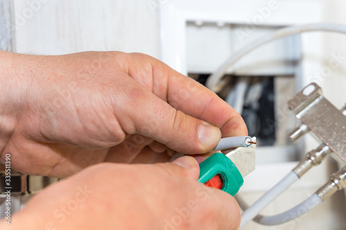 Worker removes insulation before inserting connector of a TV antenna coaxial cable to a splitter.