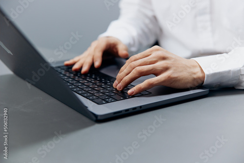 worker sits at a desk in front of a laptop Internet isolated background