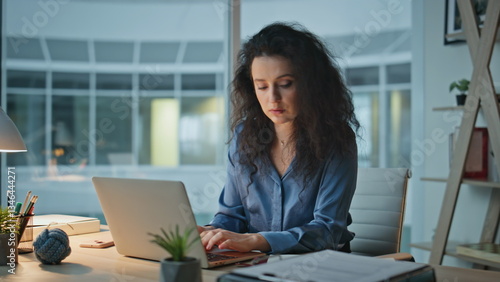 Worker think business ideas in evening office. Busy manager work typing laptop
