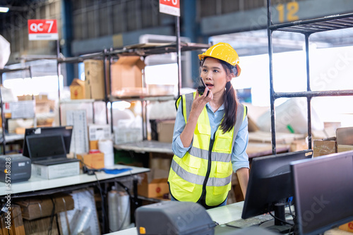 Worker working in large depot storage warehouse hold radio walkie talkie to team at cashier counter