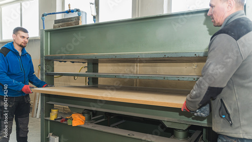 workers holding a big wooden panel and preparing to put it in a wood processing machine. High quality photo