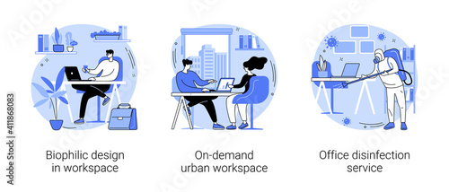 Working conditions abstract concept vector illustration set. Biophilic design in workspace, on-demand urban workplace, office disinfection service, employee safety, nature abstract metaphor.