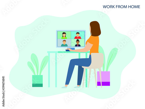 Working from home via video conference, meeting with the team in social distancing the concept of the COVID-19 pandemic, a woman stays at home, works at home, chair, conference, meeting with the team