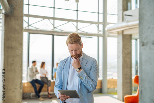 human, photogenic, leadership, attractive, corporate, business, tablet, cyberspace, workspace, studio, male, digital, people, caucasian, men at work, technology, touch, positive, suit, elegant, portrait, management, smile, modern, lifestyle, young, holding, executive, standing, person, professional, looking, work, using, manager, office, wireless, man, confident, entrepreneurship, happy, reading, businessman, entrepreneur, communication, businessperson