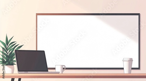 Workspace with laptop, blank whiteboard, coffee cup, and plant in cozy setting. Generative AI