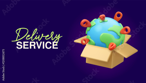 World delivery service vector 3d web banner. Planet Earth in cardboard box icon. Cartoon international logistics poster template