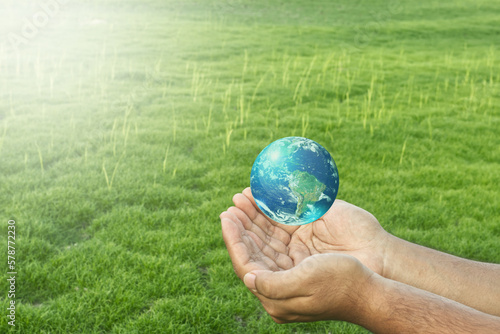 World environment day concept: hands holding earth globe on blur nature background. Elements of this image furnished by NASA
