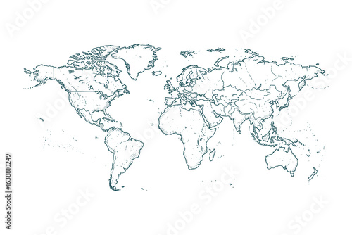 World Map Outline Sketch, Geographic Regions, Global Continent, Vector Illustration