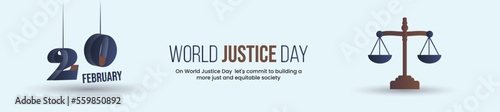 World Social Justice Day. International justice day. Social Day. 20th February. Law firm post for 20th Feb. Justice Scales of court. Raise voice for others. The scale of Justice banner on cyan back