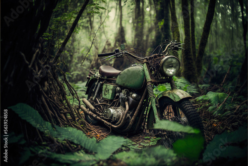 Wracked old rusty Motorcycle bike overgrown with foliage in jungle forest illustration generative ai