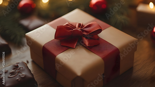 Wrapped Gift Box and Festive Ambiance: A beautifully wrapped present, adorned with a rich red ribbon, takes center stage amidst a warm, inviting holiday setting.