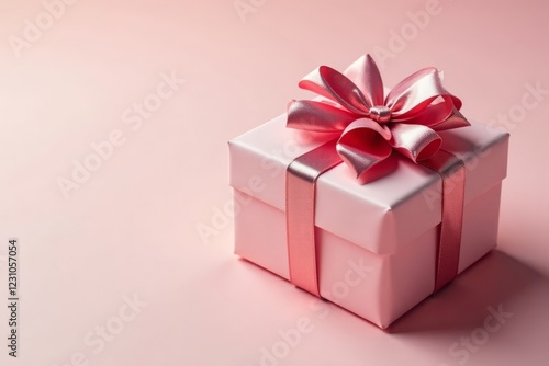 Wrapped gift on neutral background with bright colorful bow, present, gift box, wrapped