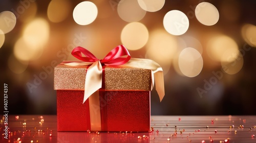 wrapping, red, foil, illustration, gift, shiny, box, elegant, gold, ribbon, bow, festive, luxurious, holiday, special, occasion, background, light, scene, beautiful, ornamented, paper, blur, focal, highlight
