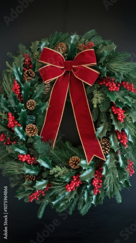 Wreath with red ribbon and green leaves