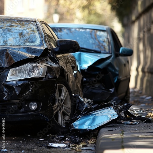 car, accident, crash, damage, collision, wreck, vehicle, automobile, broken, smashed, street, city, road, transportation, insurance, repair, metal, debris, black, blue, headlamp, bumper, fender, impact, safety, risk, emergency, danger, urban, scene, traffic, destroyed