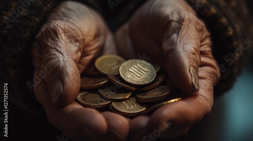 Wrinkled hands gently hold a stack of gold coins, symbolizing wisdom and wealth accumulated over time.
