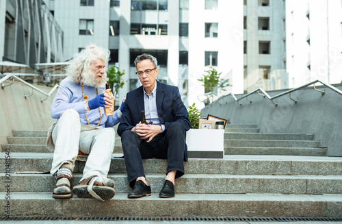 Wrinkled men. Two wrinkled men feeling relaxed drinking beer while sitting outside the office building
