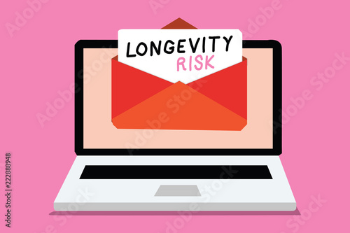 Writing note showing Longevity Risk. Business photo showcasing Potential threat due to increasing lifespan of pensioners Computer receiving email important message envelope with paper virtual