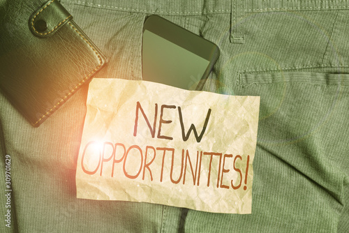Writing note showing New Opportunities. Business concept for exchange views condition favorable for attainment goal Smartphone device inside trousers front pocket with wallet