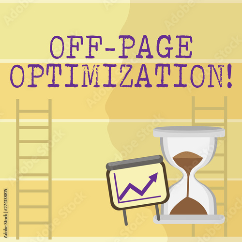 Writing note showing Off Page Optimization. Business concept for set of techniques to increase your website s is ranking Growth Chart with Arrow Going Up and Hourglass Sand Sliding