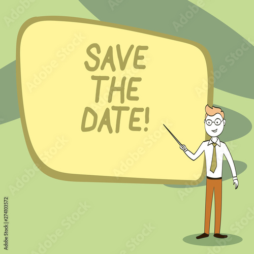Writing note showing Save The Date. Business concept for asking someone to remember specific important day or time Confident Man in Tie, Eyeglasses and Stick Pointing to Board