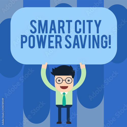 Writing note showing Smart City Power Saving. Business photo showcasing Connected technological cities electricity savings Man Standing Holding Above his Head Blank Rectangular Colored Board