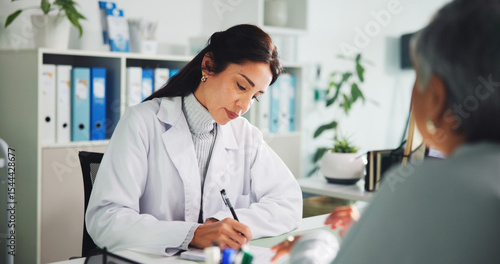 Writing, prescription and doctor with patient, office or notes for assessment, women or appointment. Clinic, mature people and medical professional with notebook for diagnosis, serious and healthcare