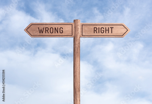 Wrong or Right concept. Words in opposite directions on signpost with sky background