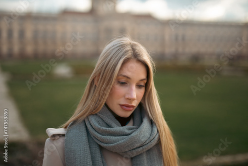 wunderful sporty woman with blond hair well dressed in park at first sunshine of a year