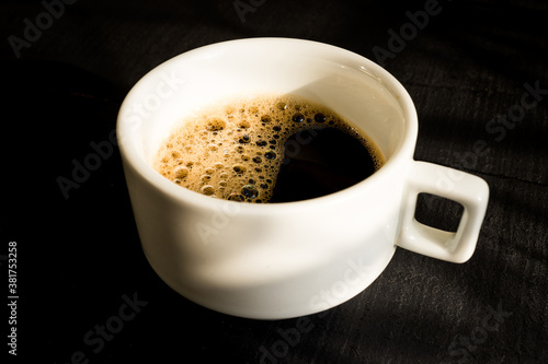 Xícara de café expresso sobre o tampo de madeira preta - Foto ao topo e perfil