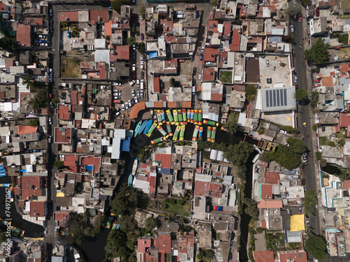 Xochimilco from the air, images of the canals and trajineras. CDMX, Mexico