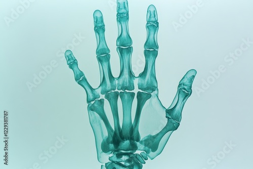 X-ray image of a human hand showcasing skeletal structure with a teal hue against a pale background