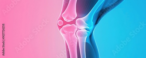 X-ray of knee joint medical tech treatment concept. Illustration of a knee joint highlighting anatomy in vibrant colors.