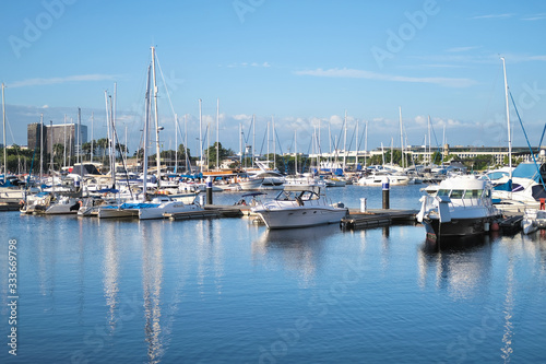 Yachts and motor boats in the port in the bay.