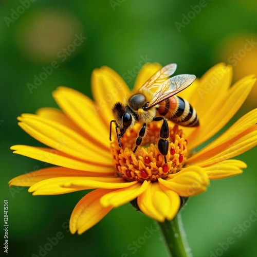 Yellow and black striped bee collecting pollen from colorful flowers, blossom, greenery, pollens