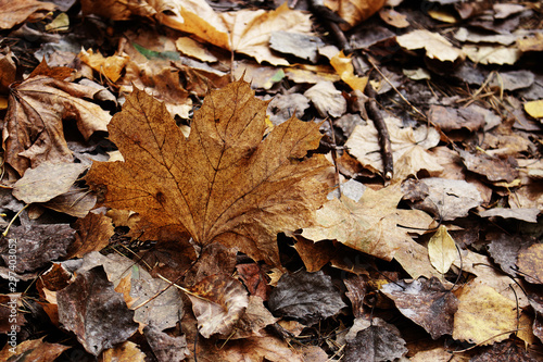 Yellow and brown various fallen leaves background with big maple leaf