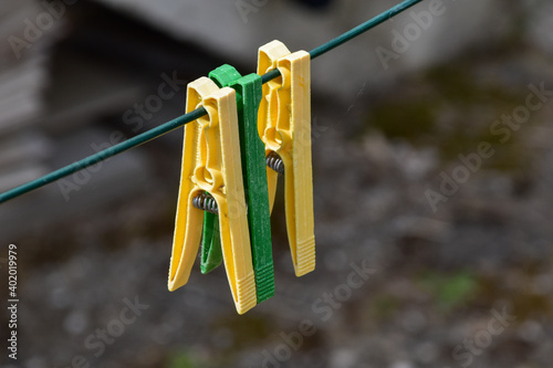 yellow and green pegs hanging outside