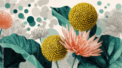flower, floral, botanical, plant, bloom, blossom, yellow, pink, green, teal, abstract, pattern, design, texture, art, illustration, graphic, background, wallpaper, decor, nature, spring, summer, garden, artistic, creative, vibrant, colourful, modern, stylish, elegant, pretty, beautiful, aesthetic, image, digital, painting, artwork, closeup, detailed, round, sphere, leaf, soft, bright
