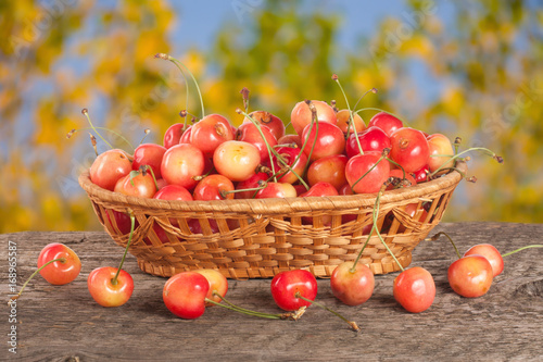 Yellow cherry in a wicker basket on a wooden table with a blurry garden background