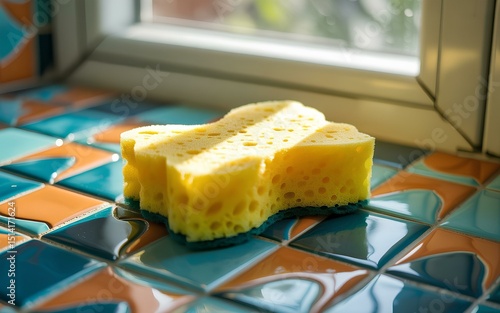 Yellow Cleaning Sponge on Colorful Tiles, clean square in kitchen for washing dishes