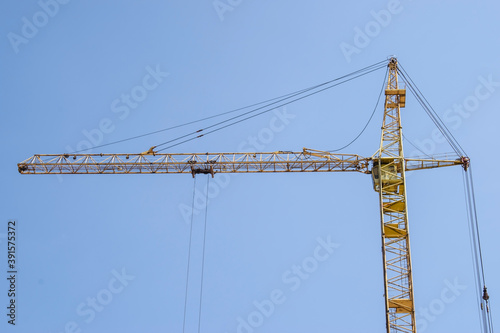 yellow crane and blue clear sky on construction site