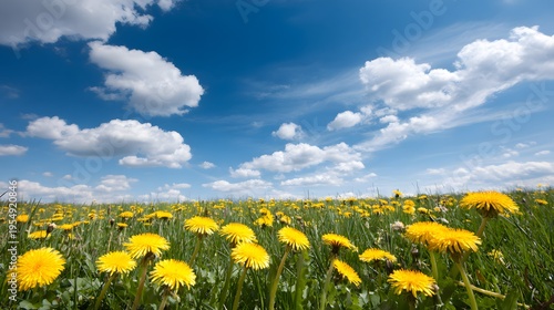Yellow dandelions blooming in green grass field under blue sky with fluffy clouds, sunny spring meadow landscape background
